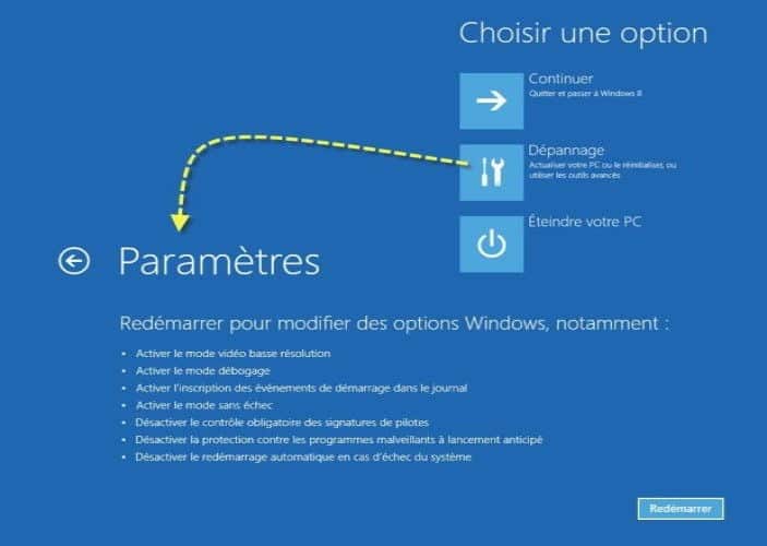 - Dans les options avancées, choisissez “Dépannage > Options avancées > Paramètres de démarrage”, puis cliquez sur Redémarrer.