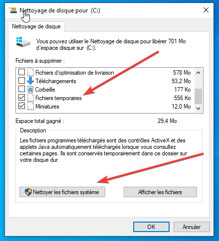 - Cochez les éléments à supprimer, validez. Pour un nettoyage avancé, pensez à “Nettoyer les fichiers système”.