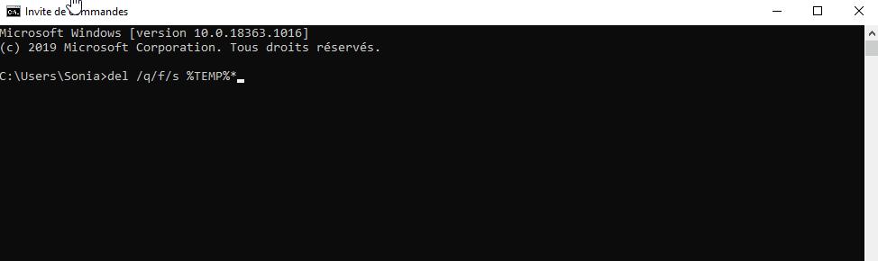 - Dans la fenêtre qui s’affiche, saisissez del /q/f/s %TEMP%\* puis validez avec Entrée.