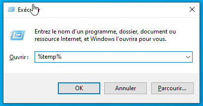 - Première étape : ouvrez la fenêtre Exécuter en appuyant sur Win + R, entrez %TEMP% puis cliquez sur OK. Sélectionnez tout (Ctrl + A), validez la suppression.